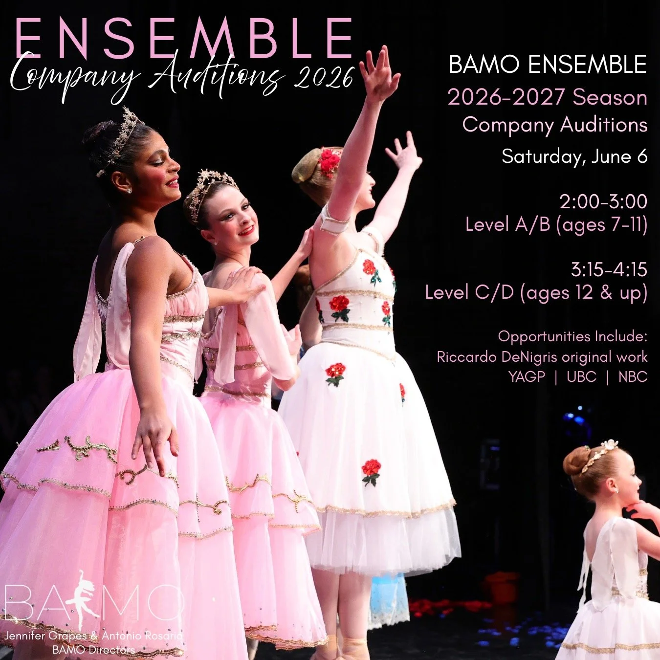 To remain eligible for Ensemble participation in the 2026–2027 season, all dancers must attend a minimum of 2-weeks at BAMO’s Summer Intensive with a world-renowned guest faculty.